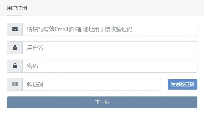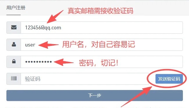 3、填写真实有效的邮箱地址,用于接收验证码,用户名填写容易记的用户名,密码设置自己的密码,点击“发送验证码”,邮箱会接收到一个6位数字的验证码,填在"验证码"位置,点击"下一步"即完成注册。