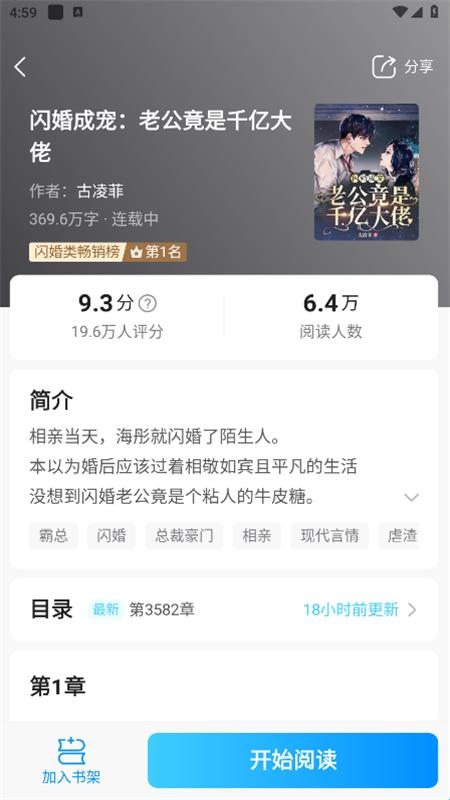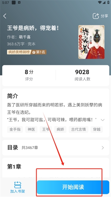 3、找到想看的小说后,点击进入作品详情页面,点击下方的开始阅读
