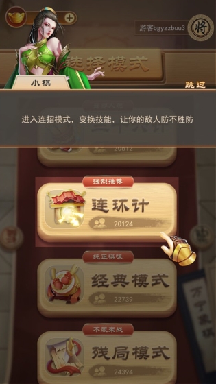 大招模式万宁象棋游戏内是自带大招模式,我们先进入游戏,选择一个自己喜欢的模式,小编进入的是连环计,我们就以连环计模式为例;