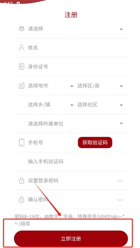 4、进入注册页面后,输入姓名、身份证号码等信息,设置好自己的登陆密码,点击立即注册即可