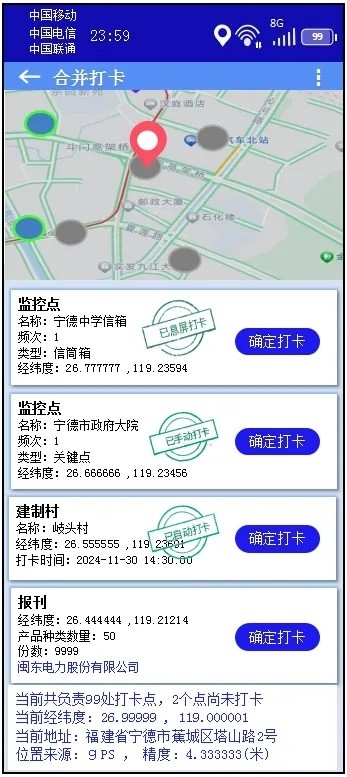 PDA中邮揽投APP进入的新功能【合并】,界面会有显示当日共负责打卡点的任务数据以及尚未完成打卡的任务数(包含外勤监控点、建制村、信筒箱)。如果打卡成功的,范围圈会由(蓝色圆圈)会变成(灰色圆圈)。