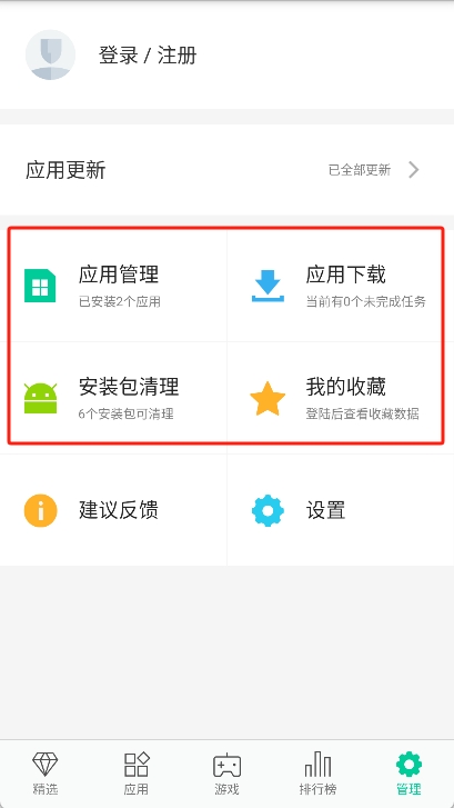 7、应用管理:在“管理”页面可以管理手机中已经安装的应用程序和游戏,包括更新、卸载等操作。