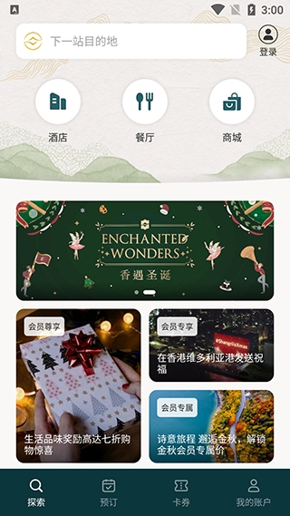 1、下载安装后打开软件进入首页,可以看到相关的会员活动和酒店、餐厅、商城等。