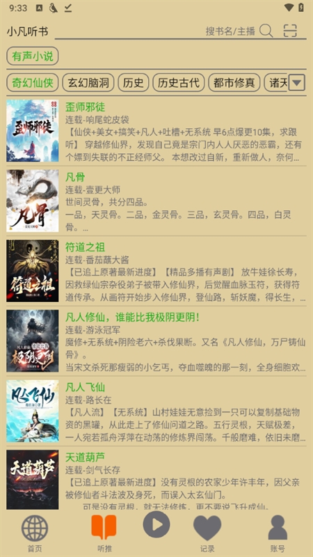 2、在听推界面下,我们能够获取到非常丰富的热门有声小说作品,包括了:奇幻仙侠、玄幻脑洞、历史古代、都市修真等等。