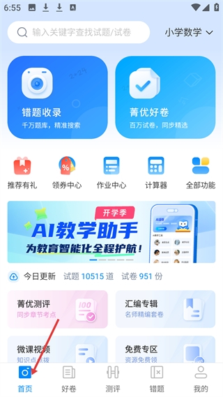 1、首页可搜索试题试卷,有错题收录、菁优好卷等功能,还设推荐有礼等模块,推AI教学助手,每日更新大量试题试卷。