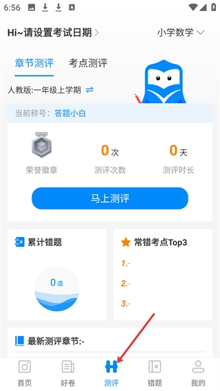 3、测评页面可设置考试日期,分章节、考点测评,显示测评次数、时长等数据,能查看累计错题与常错考点助力学习检测。