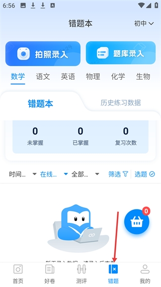 4、错题页面即错题本,支持拍照或题库录入错题,分多学科,可查看错题掌握情况、复习次数,还能筛选错题进行针对性复习。