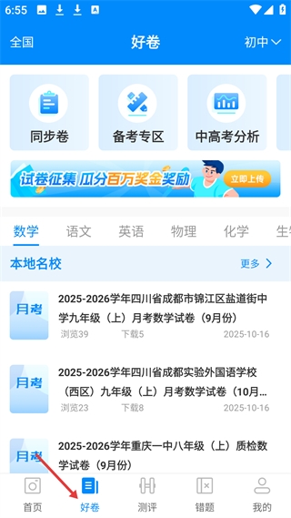 2、好卷页面分同步卷、备考专区等板块,有试卷征集活动,展示本地名校月考数学试卷,涵盖多所学校不同年级试题。
