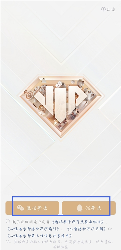 1、打开心悦俱乐部App,初始登录时可以选择微信或QQ登录,登录后自动绑定该账号。