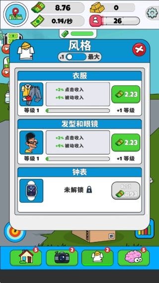 4.在风格面板中,玩家可以升级角色各项服饰,也能够提升角色的金币产生速度。