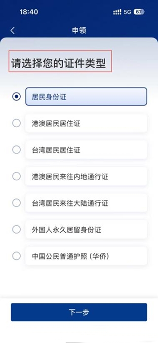 第 2步:选择对应的证件类型,一般都是居民身份证,如遇其他证件,按照图片选择对应即可;