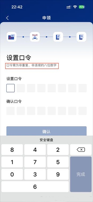 第 6步:设置口令,【仔细看清要求非重复,非连续的八位数字】;