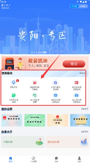 2、首页便民板块,提供贵阳专区及散装燃油购买登记等多项特色服务。