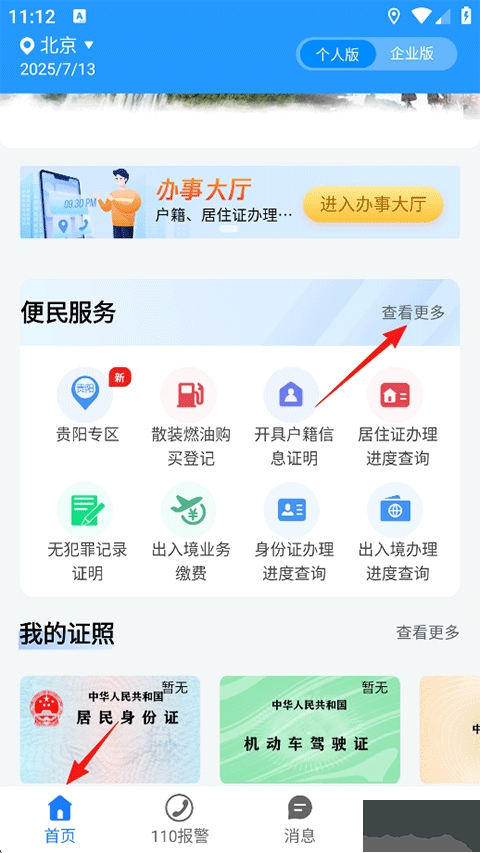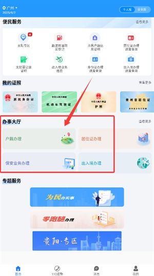 3、在首页办事大厅区域,可办理户籍、居住证等常见政务事项与业务。