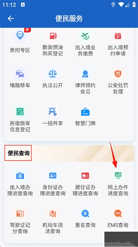 2、在便民服务页面往下滑动找到便民查询-网上办件进度查询功能;