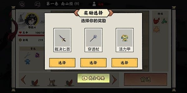 进入后玩家会遇到随机的事件,并获得三个选项,玩家可以获得武器、异兽、特性、恢复声明等。