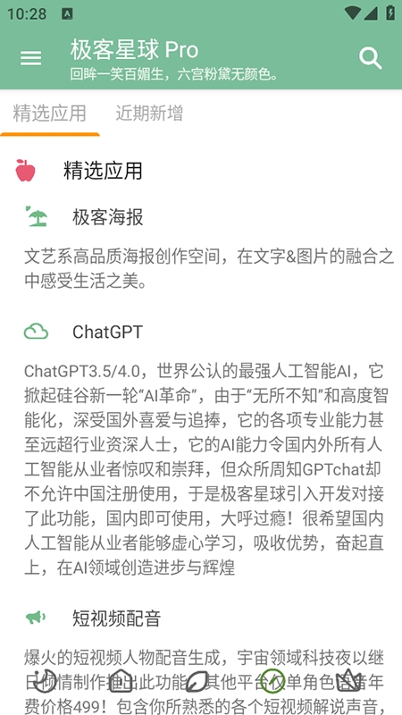 4.在 “精选应用”中,还有不少特色应用,如ChatGPT、极客海报、短视频配音、去水印等。