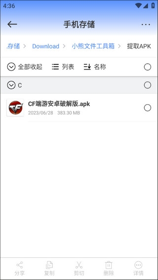 小编研究之后发现,回到app首页,点击手机存储,原来已经生成了一个提取apk后的文件夹!
