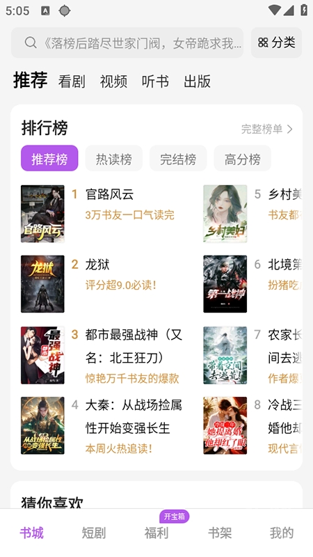2、在首页“书城”或搜索框输入小说名称,或通过分类、榜单筛选书籍。