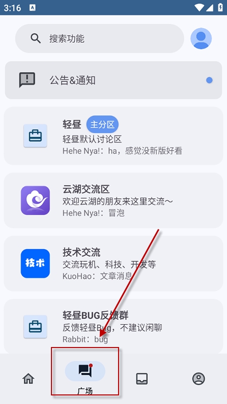 3、点击广场办款,可以进入社区交流页面进行讨论。