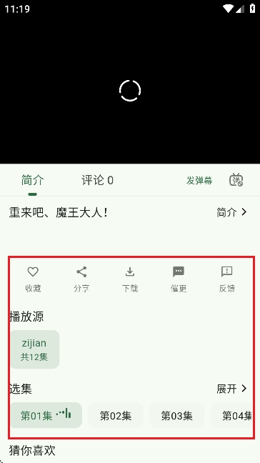 3、选择一部作品点击其封面进入到播放界面,可以进行收藏,分享,下载,催更,以及反馈问题等操作。