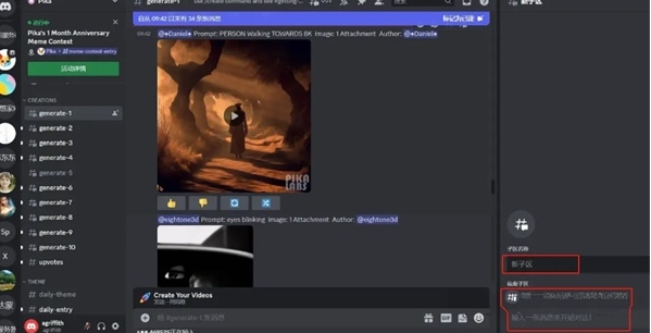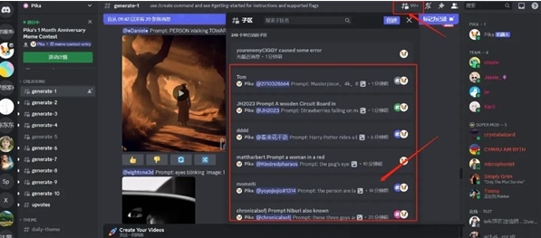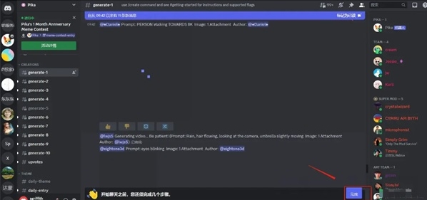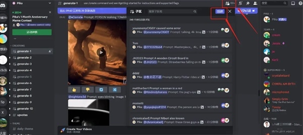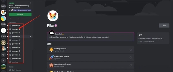 2、看到图示页面,说明已成功加入Pika,在Discord频道的左侧找到“generate”子区,随意选择一个点击进入。