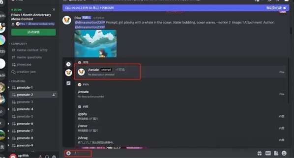 5、文本生成视频,在命令行输入框中输入“/create”命令,并输入你想要生成视频的提示词。目前Pika Labs单次生成的视频时长为3秒。