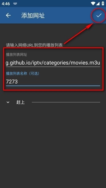 复制上面其中一个直播源,贴到“播放列表网址”下面,名称可以随意取,并点击右上角的“√”;