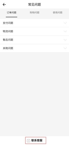 2、在这里可以查看到很多的问题,大致分为三部分(订单问题、购物问题、使用问题),在该页面的最下端可以点击“联系客服”;