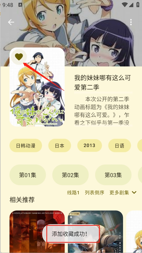 2、点开喜欢的动漫并点击收藏按钮,并显示“添加收藏成功”。