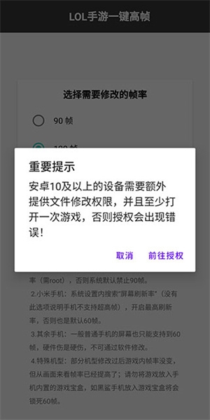 5、点击开始设置按钮后,弹出重要提示,需要我们提供文件修改权限,并且至少需要打开过一次游戏,以上条件都满足的话,点击前往授权。