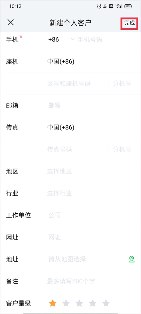 3、手动输入客户详细的个人介绍,如手机号、行业、工作单位等,标出客户的星级,填好全部信息之后就可以点击“完成”按钮了。