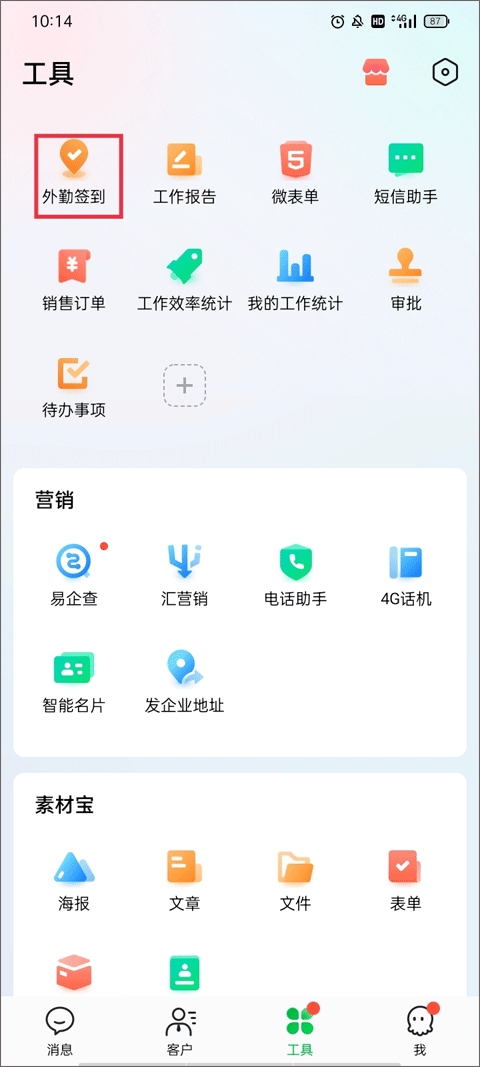 1、点击下方菜单栏【工具】界面,这里包含了很多的工具、营销、素材宝等相关内容,点击工具区域中的“外勤签到”。