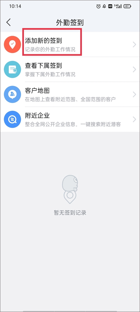 2、在外勤签到页面中,提供添加新的签到、查看下属签到、客户地图以及附近企业服务,点击“添加新的签到”。