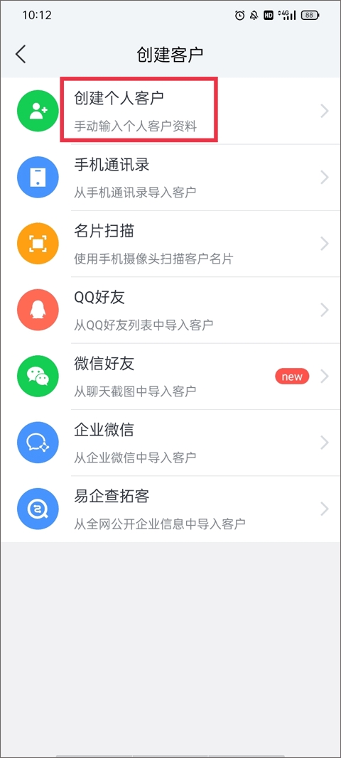 2、在创建客户页面中有很多的功能选项:创建个人客户、手机通讯录、名片扫描、QQ好友等,选择“创建个人客户”。