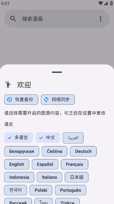 1.kotatsu是跟随系统语言自动适配的,如下图所示,小编打开软件直接就是中文版。然后点击空白处。
