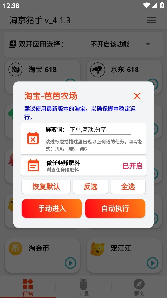 1、自动完成淘宝和京东日常任务,无需手动操作就可以自动领取活动奖励。