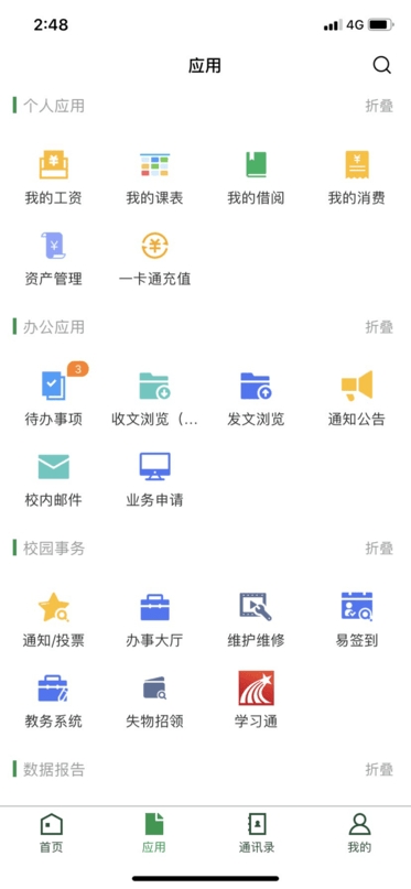 应用:含个人应用、办公应用、校园事物、数据报告、轻松校园等