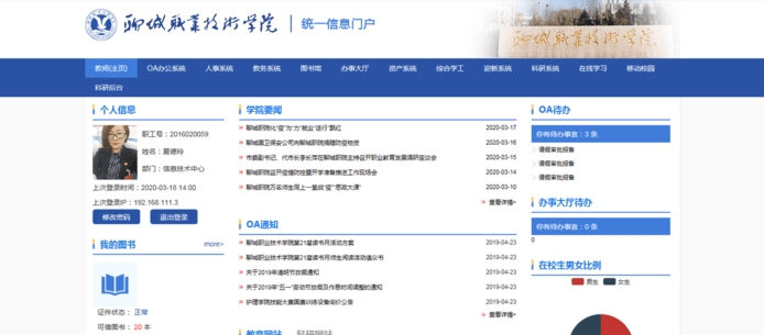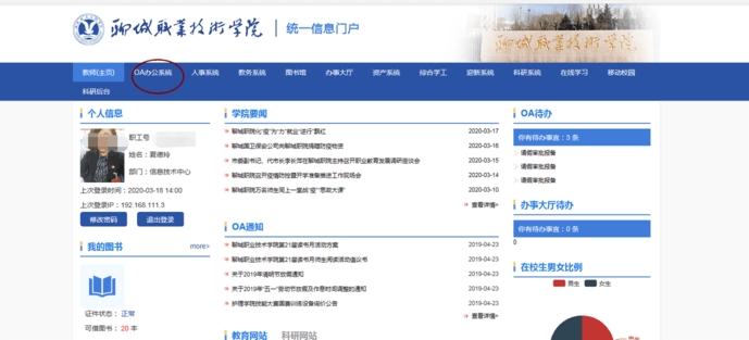 登录信息门户后,可查看自己的相关信息。如需要登录学校其他业务系统,可点击网页上方的栏目进入(如想登录OA,直接点“OA办公系统”进入办理)