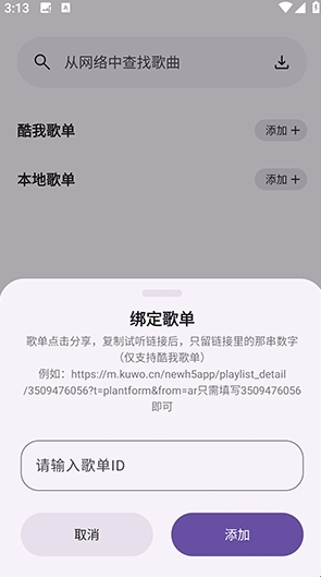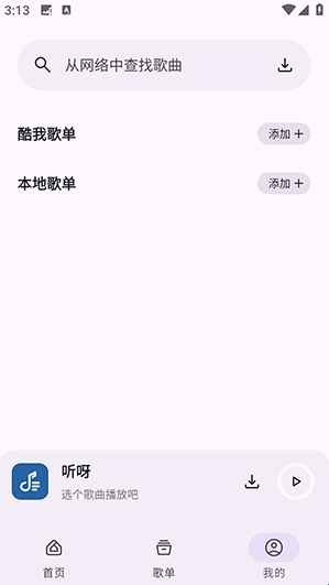 点击我的页面,这里提供了本地歌单以及酷我歌单。点击酷我歌单后面的添加。