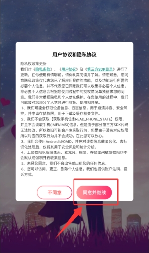 1、在用户协议和隐私协议提示中点击"同意并继续",即可进入应用。