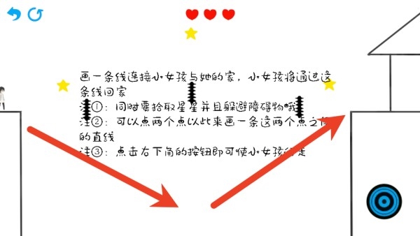 1、游戏开始后,玩家直接进入第一幅场景,通过手指在屏幕上滑动绘制连接道路,为小女孩规划从起点到家的