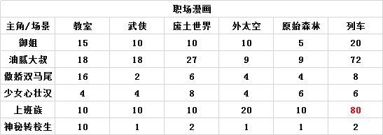 前三分别是:上班族+列车=48分;神秘转校生+教室=30分;傲娇双马尾+教室=16分、油腻大叔+列车=16分。
