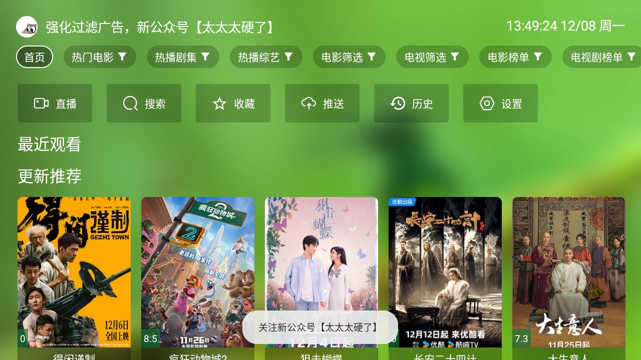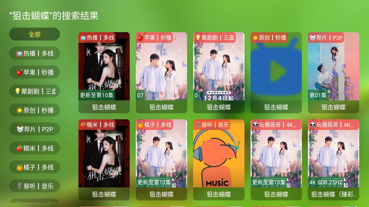 UI专为电视遥控操作优化,大图标+横向瀑布流布局,老人也能轻松上手。