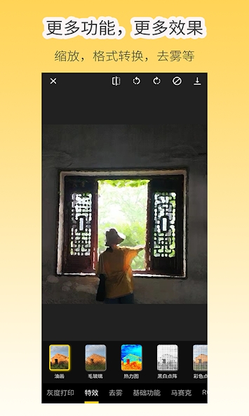 2、丰富特效:提供油画、毛玻璃、热力图、彩色/黑色点阵、反色等创意效果。