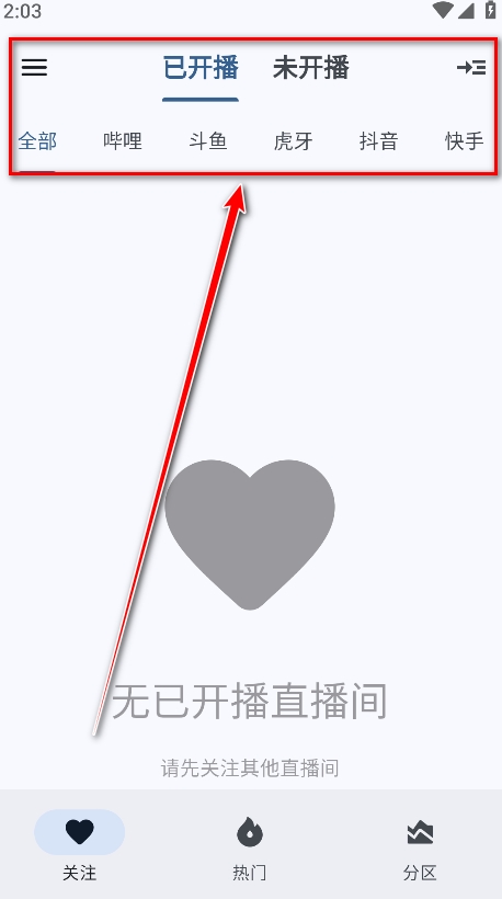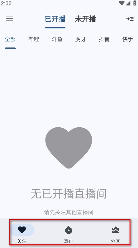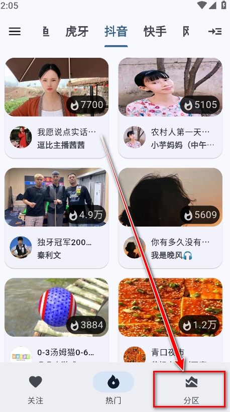 1.打开纯粹直播,可以看到主要有关注、热门、分区三大板块内容。