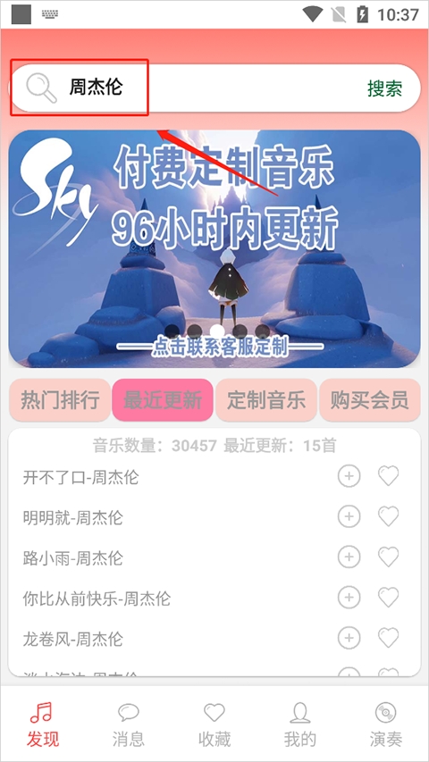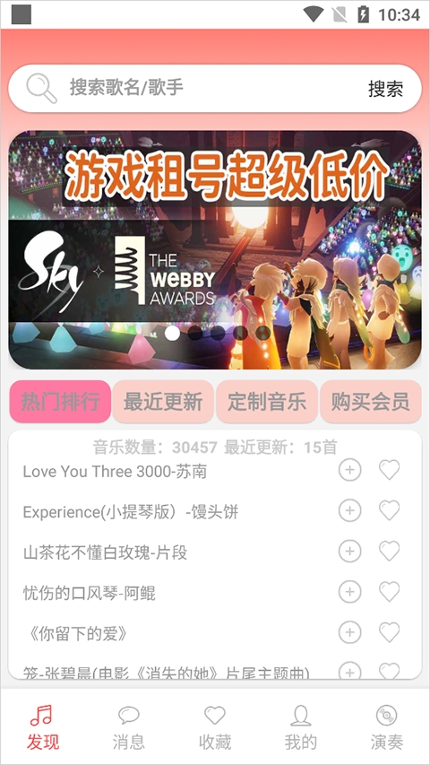 2、如果你觉得歌曲数量太多的话,可以选择搜索,或者是在热门排行榜中查看热门的歌曲。