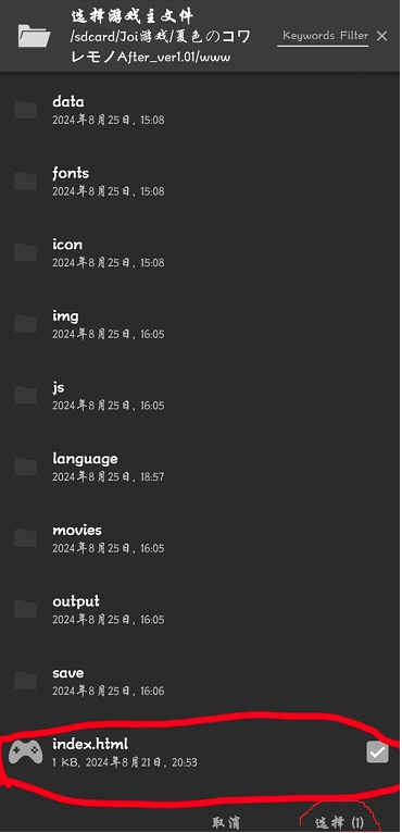 3.添加完游戏其实就可以直接启动了,但这个时候启动还没有添加翻译文件,所以启动游戏的话也是没有汉化的。想要加载翻译文件,首先需要打开文件管理器(手机自带的获取其他的文件管理器都行)。找到游戏文件夹,然后找到后缀为JSON的文件。(像夏色泡影我是直接建了一个翻译文件的文件夹,但是有时候不是每个游戏都建了这个文件夹。这个时候就需要自行在游戏文件夹里寻找后缀为JSON的游戏。)