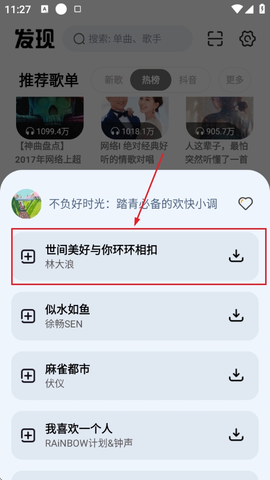 1、用户可以下载找到喜欢的歌曲并点击,开始播放后在下方点击歌曲打开对应页面