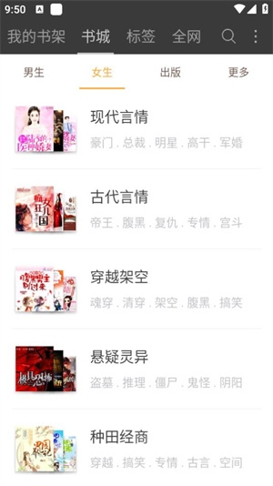 4、女生可以选择现代言情、古代言情、穿越驾考、悬疑灵异等类型的小说。